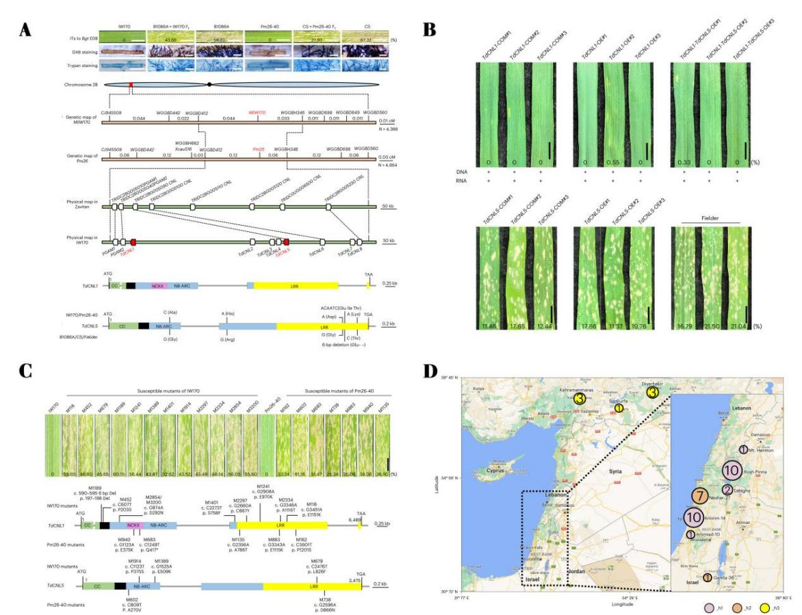 小麦白粉病是全球范围内分布最为广泛且危害严重的叶部病害之一,利用寄主抗性是控制小麦白粉病最可持续的策略。在小麦及其野生近缘种中,已发现了100多个抗白粉病基因/等位基因,其中有20个基因已被克隆,大部分编码NLR免疫受体。抗白粉病基因Pm26是戎均康教授在2000年发现并将其定位在野生二粒小麦(WEW,Triticum dicoccoides,AABB,2n = 4× = 28)品系 TTD140 的 2B 染色体短臂上。野生二粒小麦品系 IW170 的 2BS 染色体臂上也存在一个不完全显性抗白粉病基因MlIW170,比较基因组学分析将MlIW170定位到一个0.16 cM的遗传区间,与Pm26紧密连锁或等位,但它们的确切关系仍不清楚。