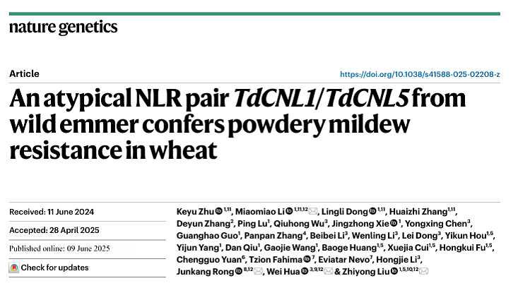 6月9日,现代开云体育平台体验活动戎均康教授与中国科学院遗传与发育生物学研究所刘志勇研究员领衔的植物免疫团队合作在《Nature Genetics》(IF=31.8)以长文形式发表题为《An atypical NLR pairTdCNL1/TdCNL5from wild emmer confers powdery mildew resistance in wheat》(《野生二粒小麦非典型NLR基因(TdCNL1/TdCNL5)协同调控小麦白粉病抗性》)的研究论文。