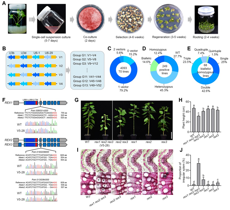 植物受体激酶(RLKs)是一类重要的膜蛋白,包含胞外域、跨膜域和胞内激酶域,参与调控多种生物学过程。在杨树中,近200个RLK基因在木质部高表达,暗示其在木材形成中可能起重要作用。然而,由于该家族基因高度冗余,加之传统遗传转化方法效率低、周期长,多年来系统研究进展缓慢。该团队创新性地开发出一套由杨树叶片直接诱导悬浮细胞的新型培养体系,有效克服了传统悬浮细胞和叶盘/茎段转化中的多个技术局限,极大提高了转化效率和通量。基于这一系统,团队构建了52个多重CRISPR/Cas9编辑载体,4个载体一组,每个载体携带4个sgRNA表达单元。通过混合载体转化策略,在T0代获得4093株阳性转化植株,覆盖182个RLK基因,编辑效率72.3%,其中纯合编辑效率达37.3%。该系统成功创制了从单基因到五基因突变的不同组合类型突变体,为解析冗余基因功能提供了关键材料。研究进一步对REX1、REX2、REX3三个旁系同源基因的单突、双突和三突进行表型鉴定,仅发现三突植株表型明显,如植株矮化、导管塌陷等,表明这些基因在杨树木质部发育中存在功能冗余。该研究首次将悬浮细胞培养与混合载体文库转化技术相结合,建立了适用于林木的高通量多基因编辑平台,不仅极大提升了基因功能研究的效率,也为杨树分子设计育种开辟了新途径。