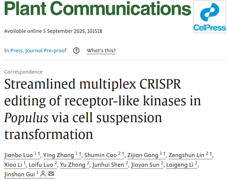 近日,开云电竞s13桂金山教授团队在国际知名期刊《Plant Communications》上发表了题为“Streamlined multiplex CRISPR editing of receptor-like kinases inPopulusvia cell suspension transformation”(《通过细胞悬浮系转化实现杨树受体激酶的高效多重CRISPR编辑》)的研究论文。该研究成功建立了一种基于叶片直接诱导悬浮细胞的高效CRISPR基因编辑平台,突破杨树高通量多基因编辑的技术瓶颈,实现了受体激酶(RLKs)大规模突变体库的快速构建,为林木功能基因组学研究和分子育种提供强有力的技术支撑。
