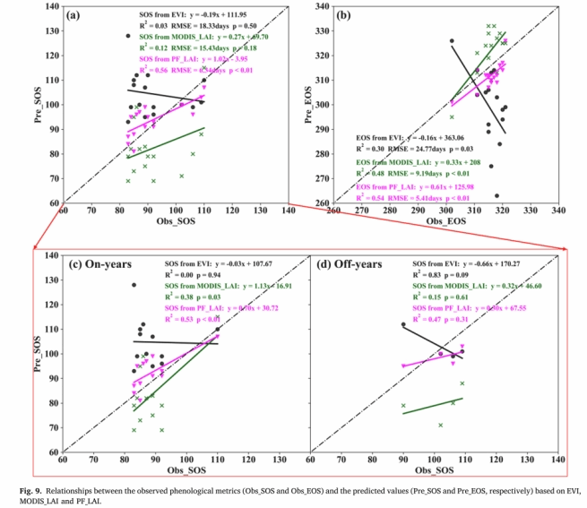 近日,国家重点实验室森林碳汇研究团队遥感领域国际顶级期刊《ISPRS Journal of Photogrammetry and Remote Sensing》(IF=8.979)发表题为“Phenology estimation of subtropical bamboo forests based on assimilated MODIS LAI time series data”的研究论文。该研究创新构建基于LAI同化的竹林SOS(生长季开始)和EOS(生长季结束)遥感反演模型,解决了传统植被指数EVI无法反演亚热带竹林物候的难题,初步探明了竹林物候的时空演变趋势,为深入研究竹林碳汇功及形成机制能提供了极为重要的关键参数。