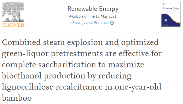 近日,国家重点实验室竹子研究团队与华中农业大学生物质能团队等合作,在能源领域国际知名期刊《Renewable Energy》(IF=6.274),在线发表了最新研究成果“Combined steam explosion and optimized green-liquor pretreatments are effective for complete saccharification to maximize bioethanol production by reducing lignocellulose recalcitrance in one-year-old bamboo”。该研究以不同年龄的竹材为材料,结合两步“绿色”预处理,发现1年生竹材(实际年龄仅2个月)能够在较温和的条件下完全降解,为竹细胞壁的综合利用提供了技术支持。