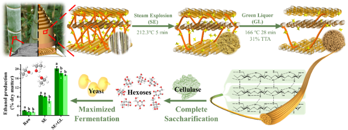 该研究通过分析不同年龄毛竹样品细胞壁结构的差异,先进行蒸汽爆破预处理(SE),再通过响应面优化绿液预处理(GL)条件,结果发现结合两步预处理方式能够有效地去除木质素和半纤维素,去除率分别达到86%和77%;研究表明通过汽爆预处理能够先去除大部分半纤维素,绿液预处理进一步去除木质素,最终导致纤维素的聚合度下降,半纤维素分支度(Xyl/Ara)增加,纤维素可及性增加,乙醇产率达到20.3%(%干物重)。该研究通过阐明蒸汽爆破和最佳绿液预处理组合显著改良木质纤维素,来阐明为什么在1年生竹材中可以获得最大的生物乙醇产量,为竹子等富含木质素的生物能源植物提供了一种高效的生物质加工技术,并为竹林的超短轮伐经营提供了技术支撑。