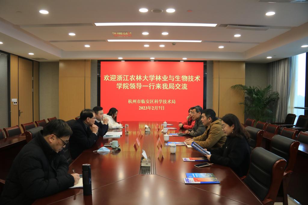 2月7日上午,林学院党委书记郑炳松一行赴临安区科技局对接交流与合作等相关事宜。临安区科技局党组书记黄文豪,局长叶剑、农社科科长陈玉、工会主席梅劲参加座谈会。