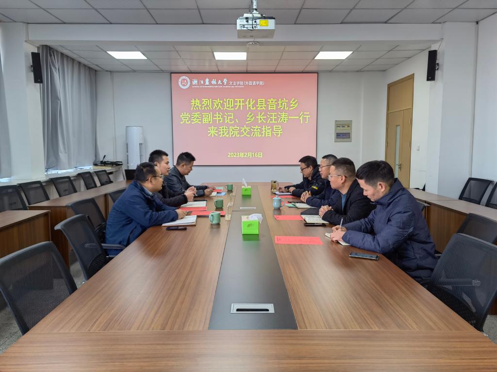 2月16日,开化县音坑乡党委副书记、乡长汪涛一行来访文法学院,就院地合作事宜进行深入洽谈,院长鲁可荣等学院领导出席并参加座谈。