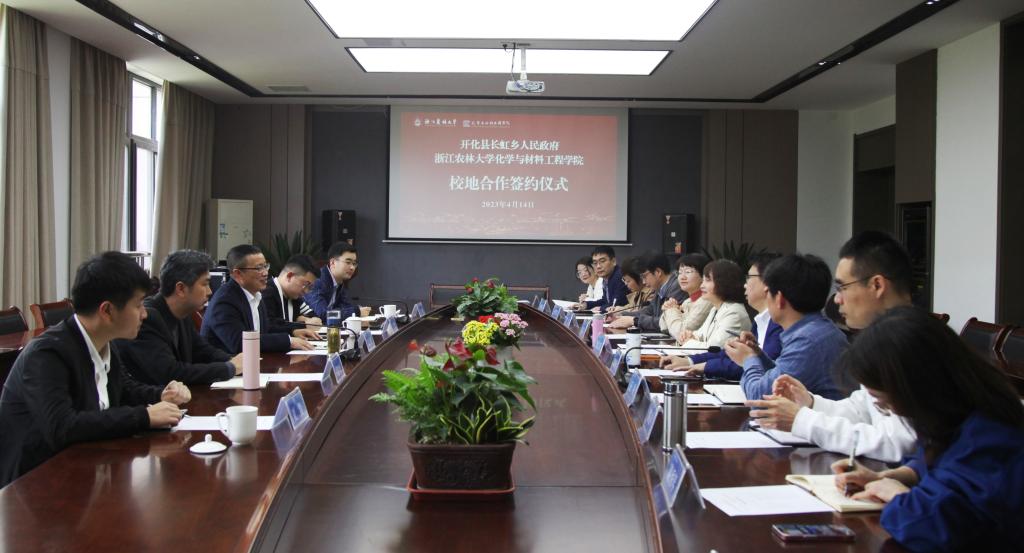 4月14日,化材学院与开化县长虹乡人民政府合作协议签约仪式在学9-306举行。长虹乡乡长邱志涛一行及化材学院党政班子和相关教师代表参加会议。