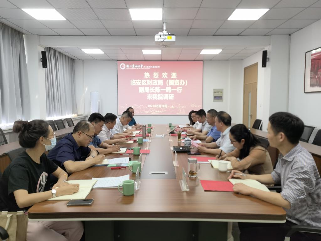 5月18日,临安区财政局(国资办)副局长陈一鸣带领城投集团、国兴集团、新锦集团、科投集团等临安国有企业相关负责人到文法学院调研,对接院地、院企合作相关事宜。文法学院院长鲁可荣、党委书记朱红东等班子成员,学生处、合作处相关负责人,文法学院院办、学生办等负责人参加座谈。