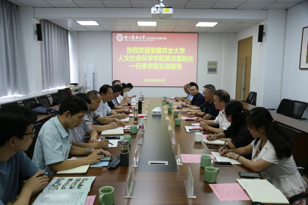 8月14日,安徽农业大学人文社会科学学院院长黄洪雷一行10人到文法学院交流合作,学院院长鲁可荣、党委书记朱红东等全体班子成员以及法学学科、中文学科和公共管理学科等相关负责人参与交流座谈。