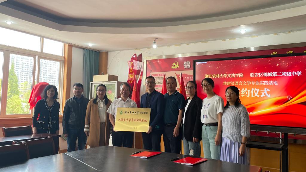 10月19日上午,文法学院与临安区锦城第二初级中学(以下简称“锦城二中”)签署共建汉语言文学专业实践教学基地协议,并举行揭牌仪式。文法学院党委书记朱红东及学院、中国语言文学学科、汉语言文学专业相关负责人,锦城二中校长凌平、副校长厉仁华、教务主任、各年级语文组备课组长等参加了签约及揭牌仪式。