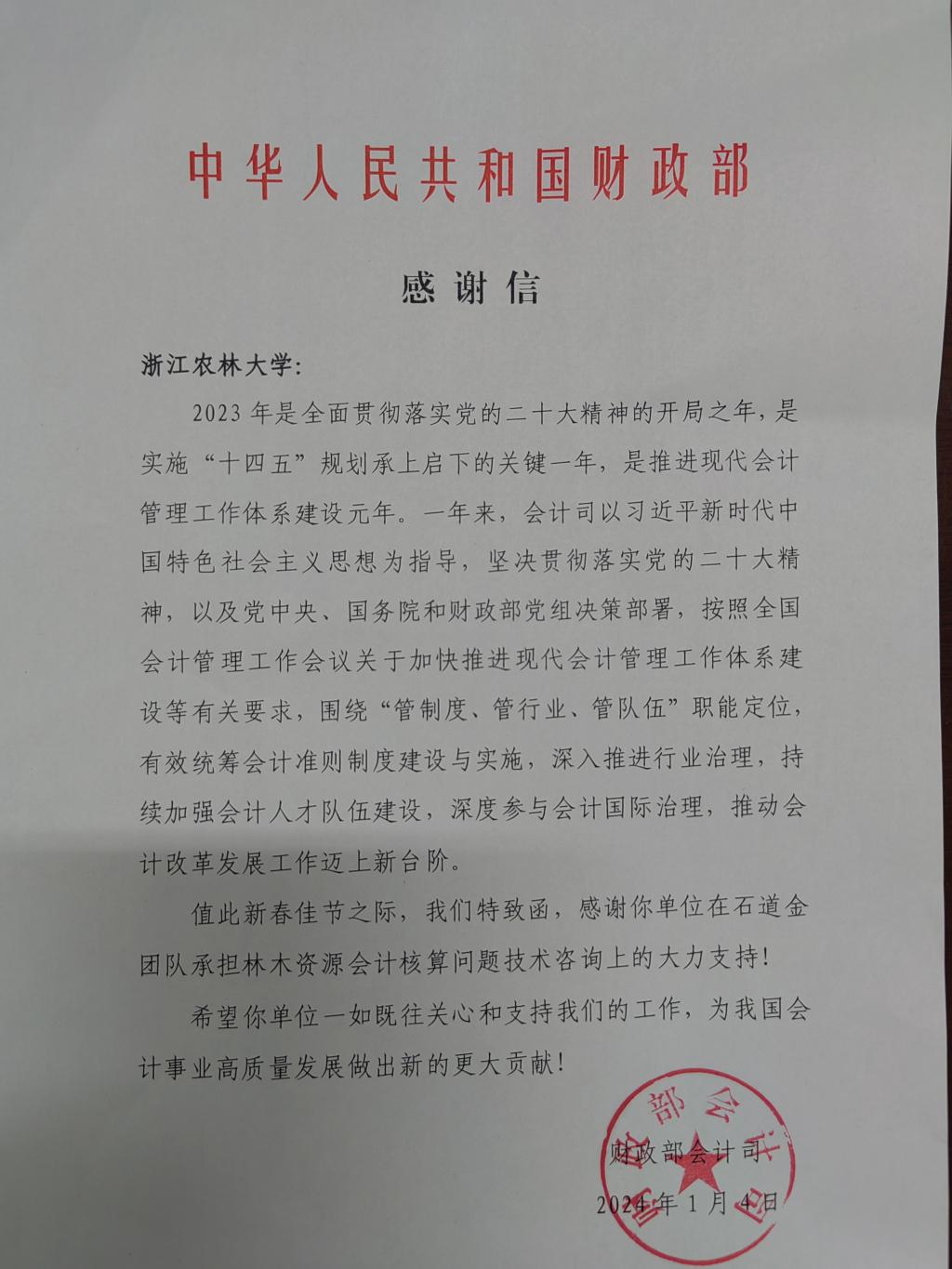 日前,财政部会计司专门给我校发来感谢信。信中高度肯定了经管学院石道金教授团队在财政部会计司工作中克难攻坚、勇挑重担,对推进现代会计管理工作体系建设做出的辛勤付出表示了充分肯定,并对我院围绕中心、服务大局,积极推动会计改革发展工作做出的突出贡献表达了诚挚谢意。