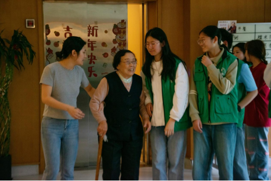 在长者们午睡结束后,依次将他们搀扶进入提前布置好的演出场地。