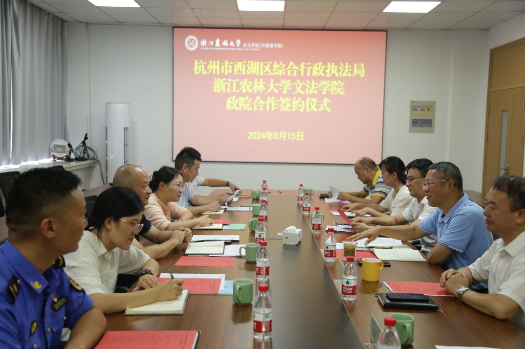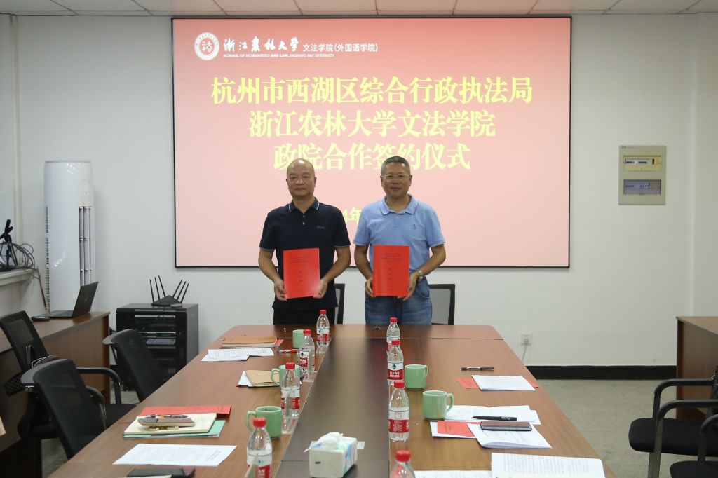 8月15日,文法学院与西湖综合行政执法局举行政院合作签约仪式,探索政院合作共建新模式。西湖区综合行政执法局党委委员、副局长吴树农,文法学院院长鲁可荣,学院相关负责人及公共管理和法学学科等部门负责人出席签约仪式。签约仪式由学院党委书记朱红东主持。