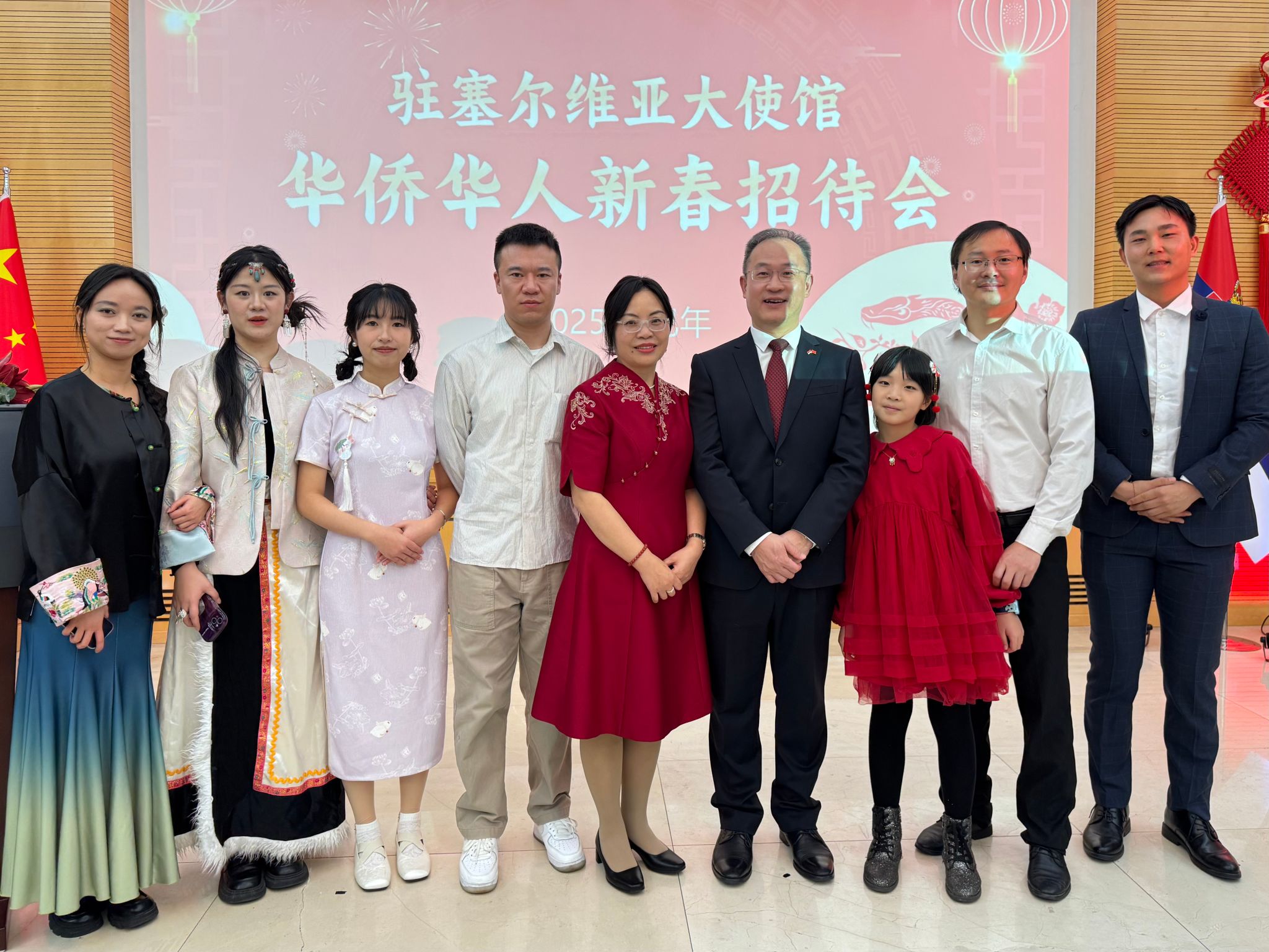 当地时间1月13日,中国驻塞尔维亚大使馆举办蛇年华侨华人新春招待会。驻塞大使李明、在塞各中资企业、各界华侨华人以及诺大孔院教师等近五百人应邀出席活动。