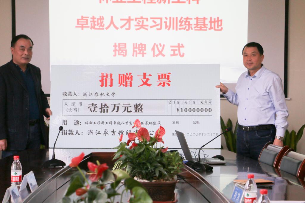 金春德和胡志庆代表院企双方签订了《“党建+产学研”院企战略合作框架协议》,并共同为“林业工程新工科卓越人才实习训练基地”揭牌。同时,学院聘请胡志庆董事长担任客座教授,郑华峰人力总监为职业规划指导老师。永吉公司向学校教育基金会进行了首批公益捐赠,主要用于支持大学生实习实践活动。