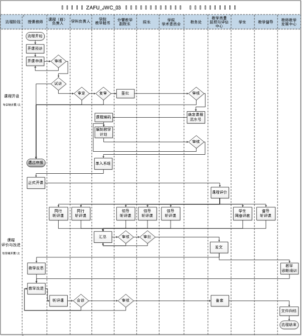 六、健全课程建设管理流程。完善课程开设、建设、评估及改进等管理工作流程(见附件2),严格课程的规范化与标准化建设,强化课程质量的评估与持续改进。