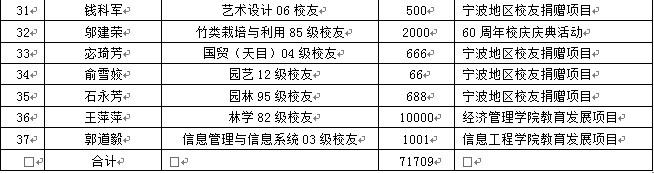 下一条:杭州贝尔塔生物技术有限公司李龙先生及竹类栽培与利用87级杨其岳等校友捐赠人民币壹万陆仟贰佰陆拾玖元零壹分,特此鸣谢!