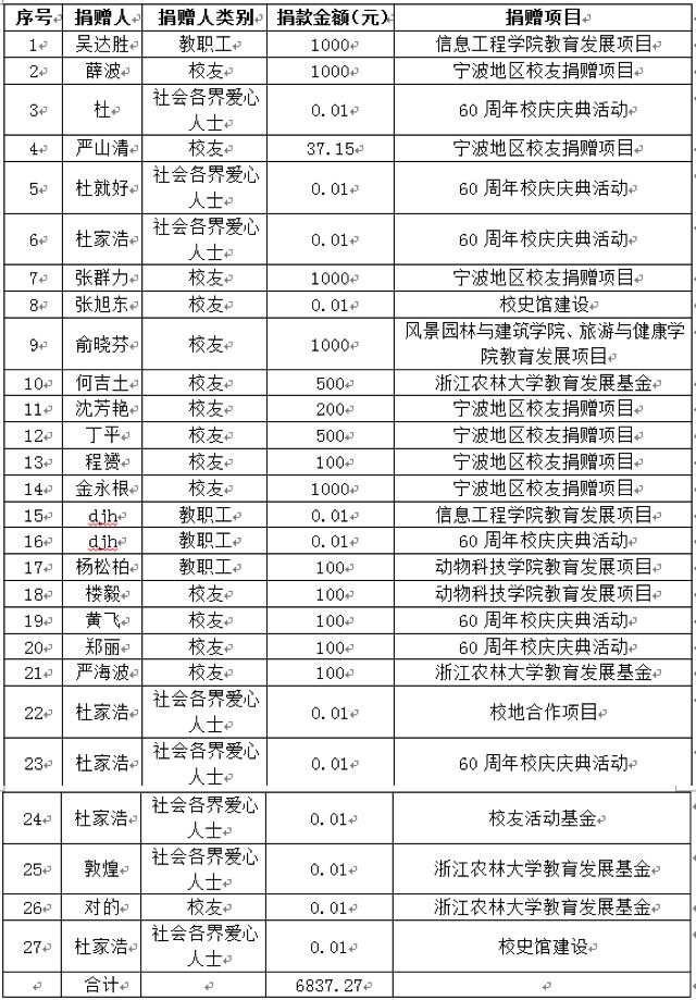 2018年10月11日,经济林87级薛波等校友及吴达胜等教职工共捐赠人民币陆仟捌佰叁拾柒元贰角柒分元,特此鸣谢!
