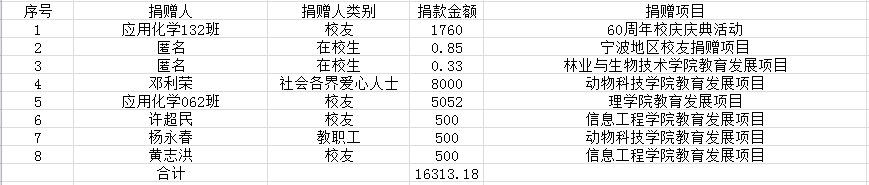 2018年10月15日,应用化学062班校友等校友及邓利荣等社会各界爱心人士共捐赠人民币壹万陆仟叁佰壹拾叁元,特此鸣谢!