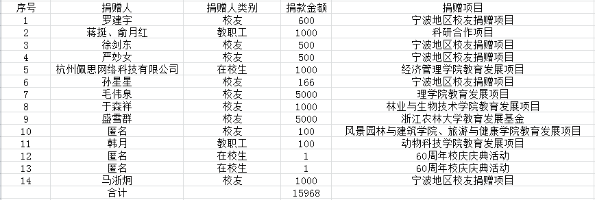 2018年10月17日,林学091班校友盛雪群等校友及蒋挺、俞月红等教职工共捐赠人民币壹万伍仟玖佰陆拾捌元,特此鸣谢!