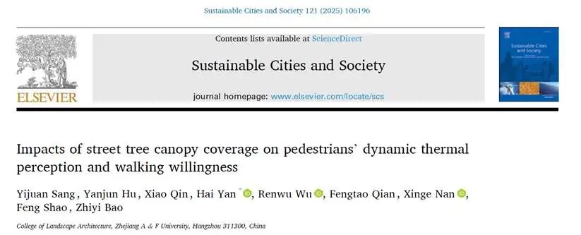 论文聚焦街道树冠覆盖率对行人动态热感知与步行意愿的影响机制,结合现场微气象监测与行人主观问卷调查,量化分析不同树冠覆盖水平下行人的热感知变化及其行为响应。研究结果表明,较高的树冠覆盖率能够显著降低行人热压力,改善热感知并提升步行意愿,为街道绿化精细化配置与行人友好型街道设计提供了实证依据。硕士研究生桑溢娟为第一作者,晏海副教授为通讯作者。