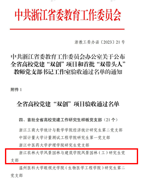 近日,省委教育工委办公室公布了第二批全省高校党建“双创”项目和首批“双带头人”教师党支部书记工作室通过验收名单。学院风景园林(工)研究生党支部通过首批全省高校党建工作研究生样板党支部验收。