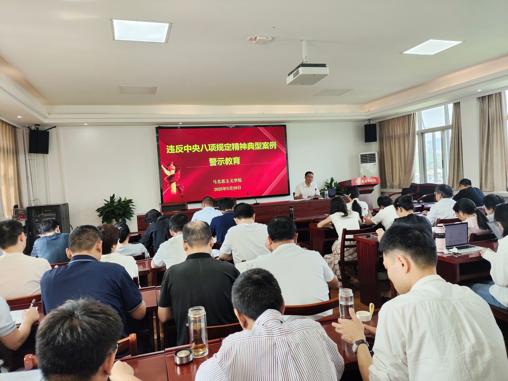5月29日,马克思主义学院党总支书记周凯为全体教师作“深入贯彻中央八项规定精神推进党的自我革命”专题党课,全体教师参加会议。