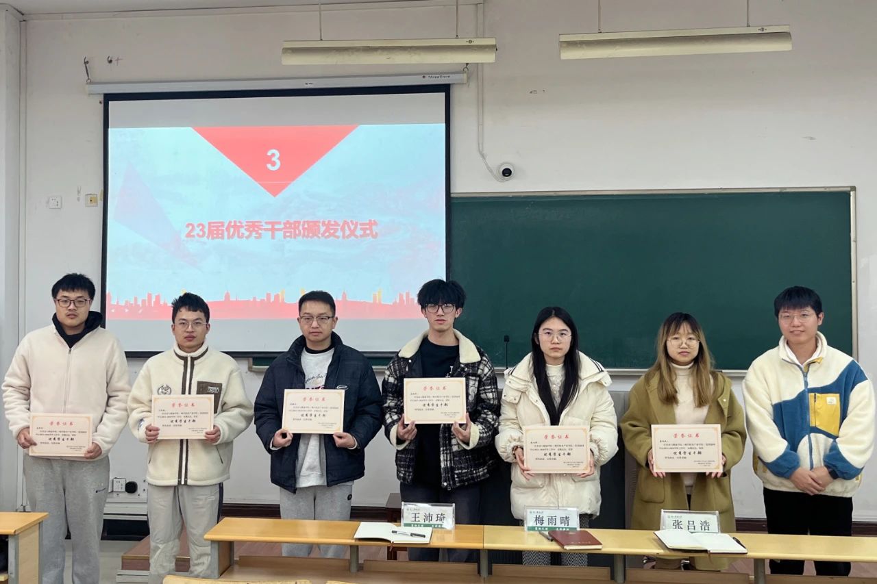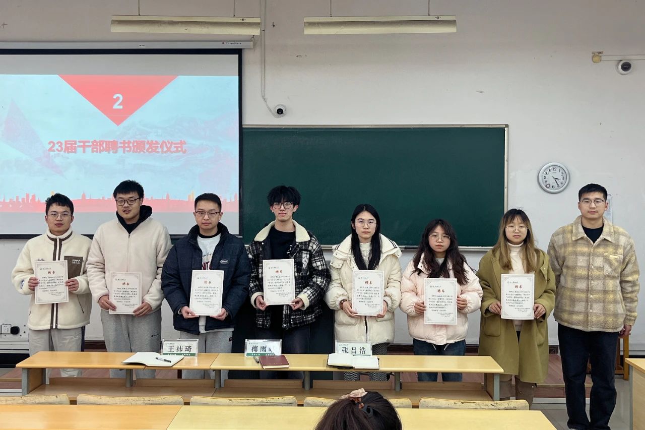 随后举行了党团协同中心2024届学生干部聘任仪式和2023届优秀学生干部颁奖仪式,各支部书记为学生干部颁发聘书和奖状并合影留念。梅雨晴对2023届党团协同中心学生干部在任期间的辛勤付出表示感谢,并希望新一届学生干部不断提升和完善个人工作能力,改进不足,为推动学院党务工作新发展贡献力量。