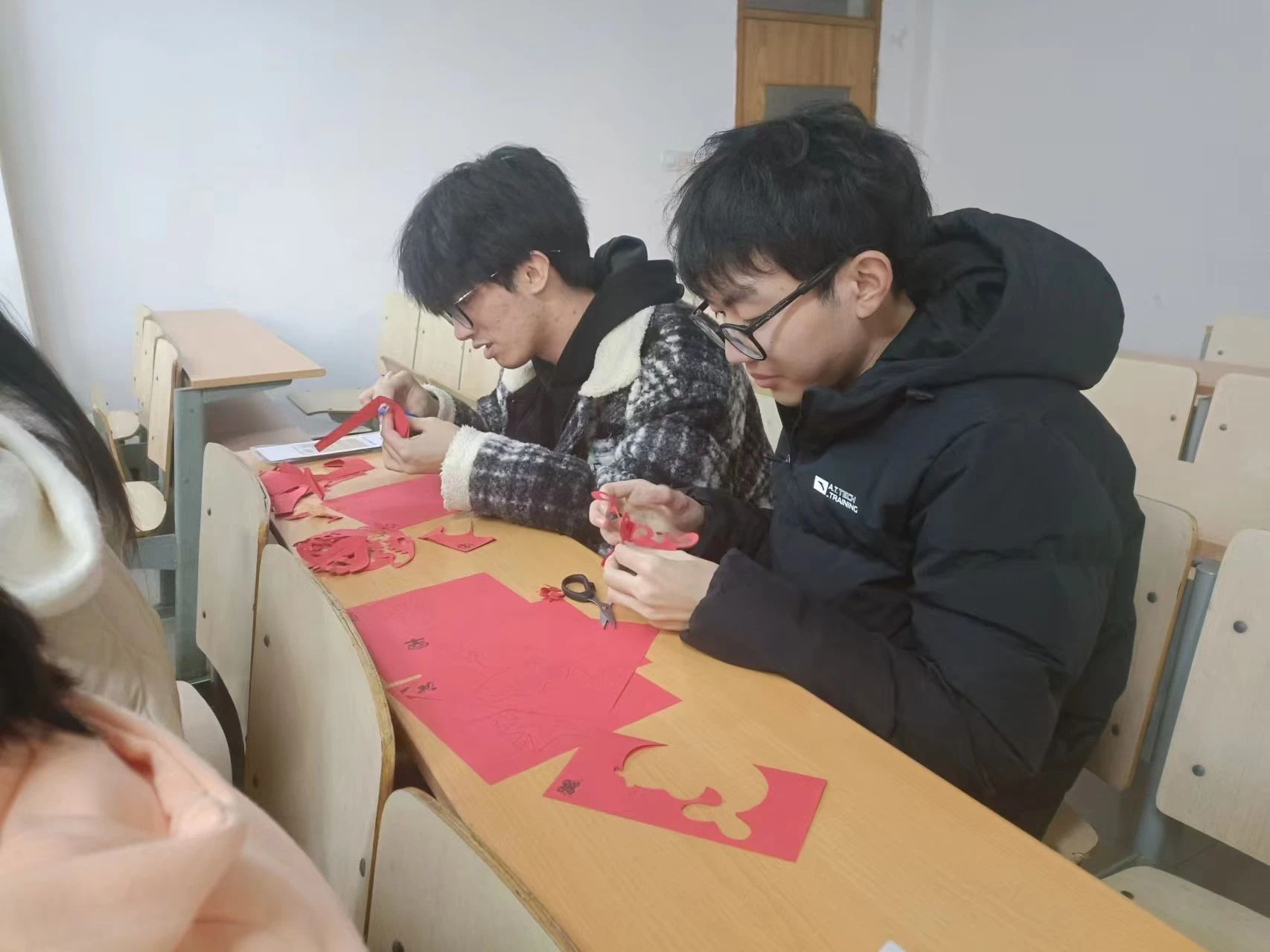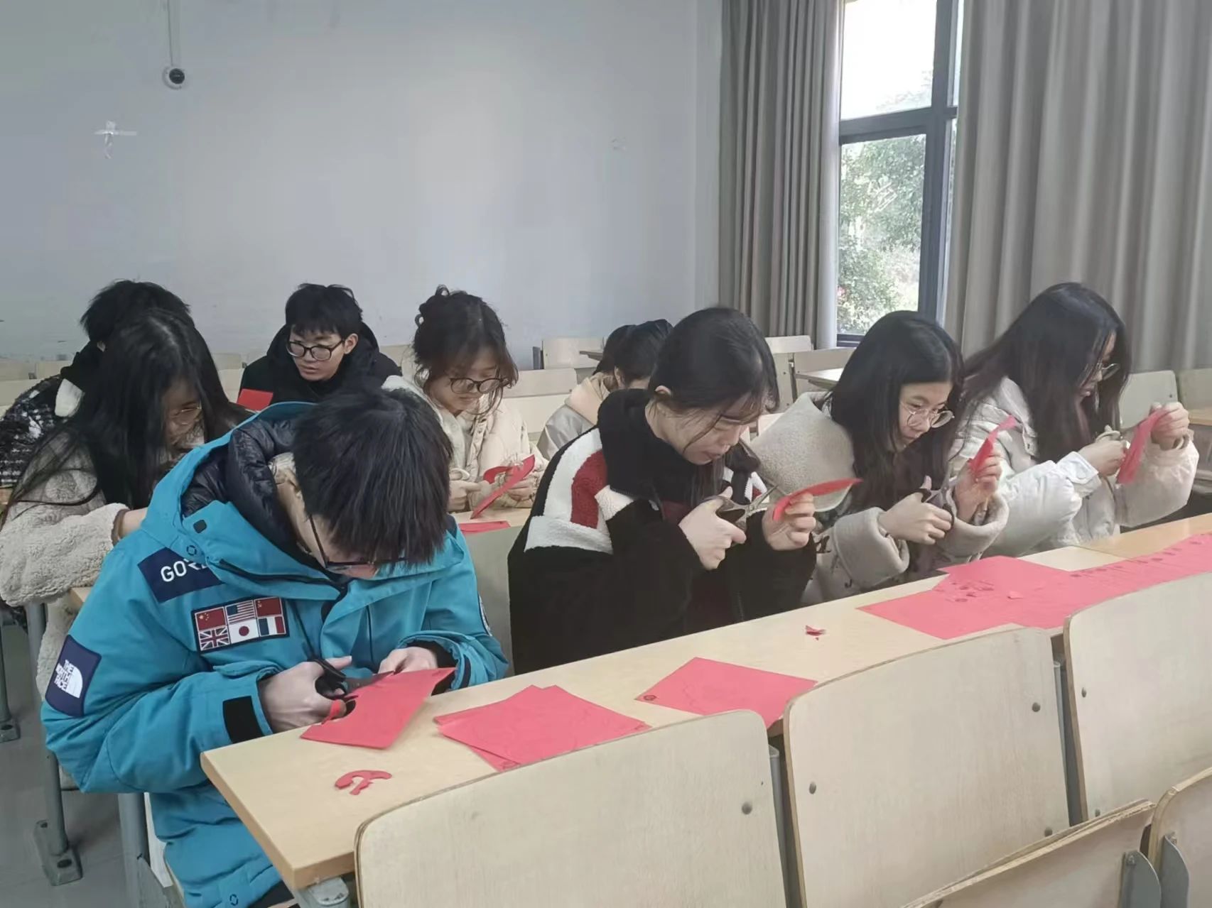 制作过程中,成员们相互学习、交流探讨剪技巧,进一步培养团队合作能力,提高支部凝聚力。完成后成员们交换窗花,以窗花为寄托,互相送出在生活、学习、工作等各个方面的美好祝福。