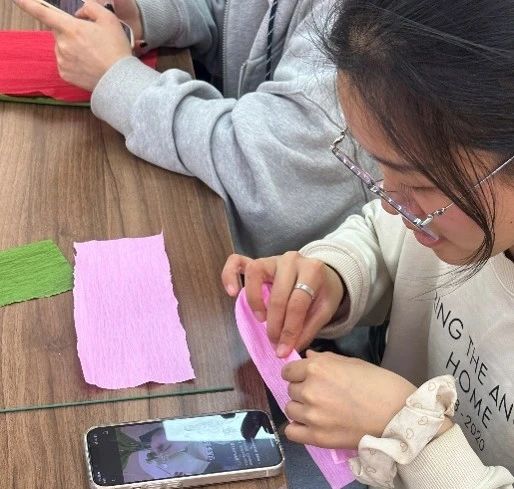 活动伊始,党员们坐在桌前详细地了解折纸花的制作过程以及注意事项,各自挑选了自己喜欢的颜色。随后,党员们充分发挥主观能动性,互相交流、互相帮助。遇到问题时,大家围坐在一起,共同探讨解决方案。现场气氛热烈而温馨,充满了浓厚的制作氛围。经过一番努力,一朵朵鲜艳欲滴的皱纹纸花在党员们的手中诞生。这些花形态各异,有的娇艳盛开,有的含苞待放,无不展现出党员们的心灵手巧与创造力。活动结束后,党员们将玫瑰赠与了校园中默默奉献的人,感谢他们日复一日对我们的关心照顾。