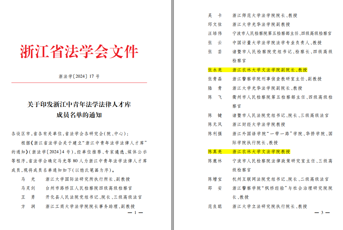 根据浙江省法学会《关于建立“浙江中青年法学法律人才库”的通知》(浙法学〔2024〕4号),经单位推荐、专家遴选、媒体公示等程序,省法学会确定80人为浙江中青年法学法律人才库成员。文法学院张永亮教授、陈真亮教授入选浙江中青年法学法律人才库。
