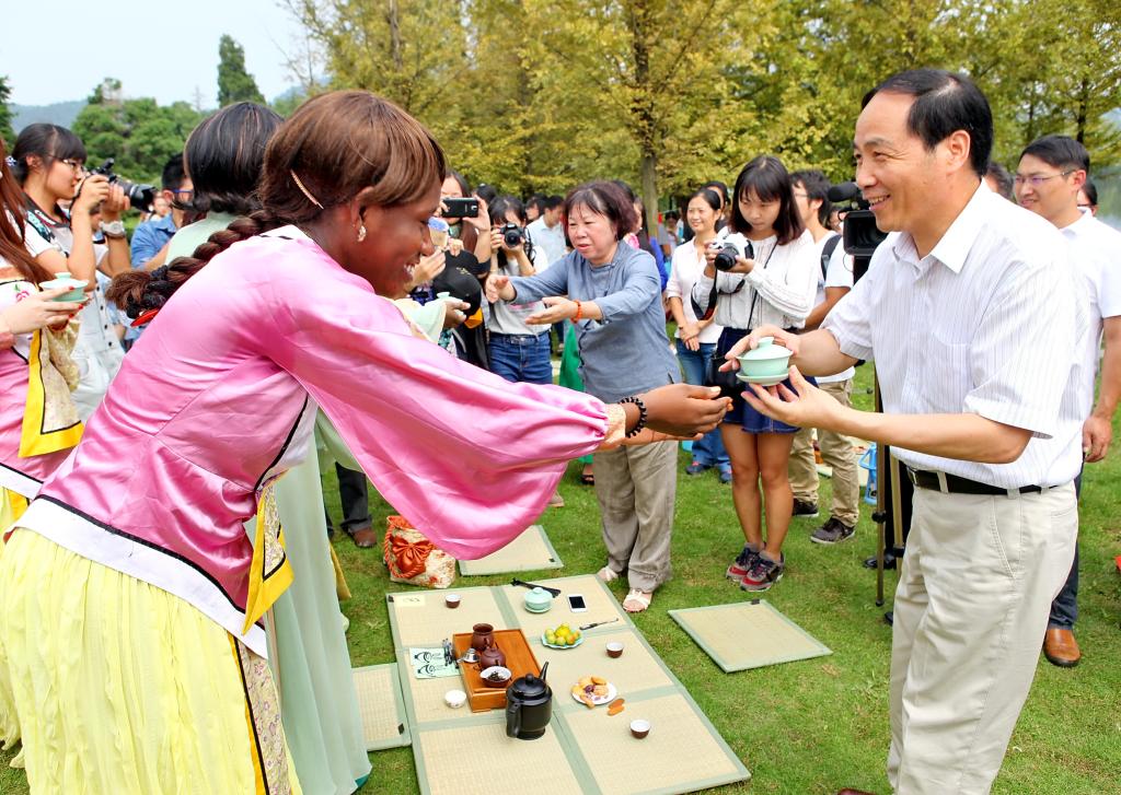 2.以茶载道,共品茶文化。对内,每年多次举办茶文化培训班,为各地茶人提高理论素养提供服务;建设对外汉语教学中茶文化相关教材,打造的全套共12册茶文化教材已成书出版,进行多国翻译,推动茶文化的传播与发展。对外,构建以茶文化为内容的国际化呈现平台,出访瑞典、美国、法国、俄罗斯、印度等多个国家,演绎中国茶文化的精髓;以孔子学院为纽带,与14家国外高校或孔子学院进行茶文化国际传播和教学合作;学校倡导发起的“全民饮茶日”,被正式列为杭州地方性法定节日,2008至今学校连续8年承办该项活动。