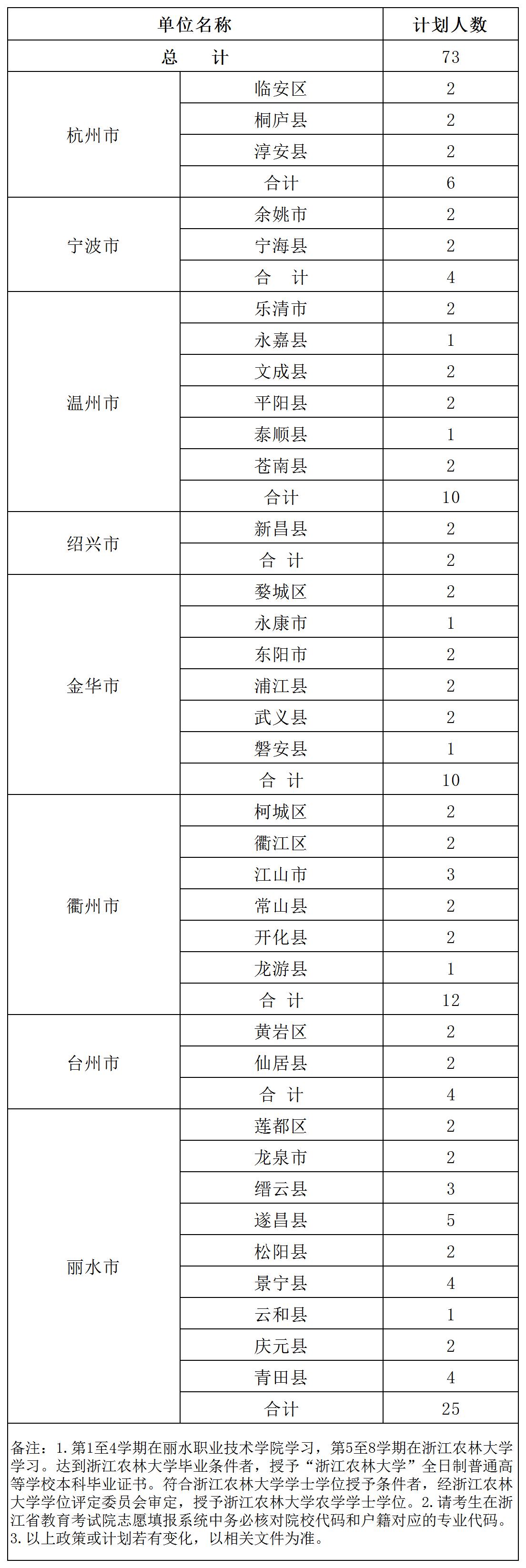 经浙江省教育厅、浙江省人力资源和社会保障厅、浙江省林业局批准,2023年继续由我校与丽水职业技术学院承担定向培养基层林技人员工作,为省内部分县(市、区)定向培养基层林技人员73名,招生专业为林学(林业技术)。有关招生事项简介如下: